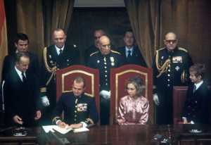 Poco después, tras una lenta agonía, en Noviembre, muere el dictador siendo proclamado rey el elegido , Juan Carlos I, que jura las leyes Fundamentales del Movimiento, creadas por el franquismo apuntando a que será fiel al que le ha nombrado rey , puenteando al legitimo heredero de la Corona, su padre don Juan de Borbón.