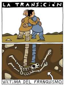 Hay una verdad innegable que nos pesa a los demócratas : la dictadura no fue derrotada. Franco murió en la cama y miles de españoles, en una larga fila siniestra de agasajo al muerto, presentaron sus respetos en un velatorio con España sumida en el luto. No se derrotó al fascismo como en el resto del mundo, tampoco hubo en España una revolución como la portuguesa donde el pueblo uniera fuerza con su ejercito buscando la democracia. El franquismo, por tanto, no desaparece sino que se perpetúa vestido con ropajes democráticos.