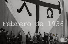 Es sumamente interesante que cuando se hace referencia a la victoria del Frente Popular de febrero de 1936, aparezca –acompañando a la voz del narrador– una imagen con dirigentes republicanos en un acto público bajo simbología masónica. No se trata de ocultar que muchos políticos españoles pertenecieron a alguna logia, pero asociarlos de manera genérica a estas corrientes doctrinales enlaza a la perfección con el discurso franquista referente a “la conspiración judeo-masónica” que impulsó el “Alzamiento”.