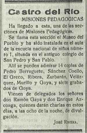 Entre los días diecisiete y veinticinco de diciembre del año 1931, se realizó la primera de esas Misiones Pedagógicas en la localidad segoviana de Ayllón.