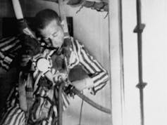 Un prisionero en una cámara de compresión pierde la conciencia (y más tarde muere) durante un experimento para determinar las altitudes a las que la tripulación de una aeronave podría sobrevivir sin oxígeno. Dachau, Alemania, 1942. United States Holocaust Memorial Museum