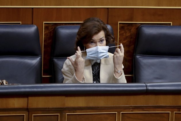 "El Gobierno no habla de lo que hace la justicia, de lo que hace la justicia de otro país", ha asegurado Carmen Calvo. En cambio, ha contrapuesto, "sí que hablamos de la plenitud de funciones y del papel de garante del rey Felipe VI".