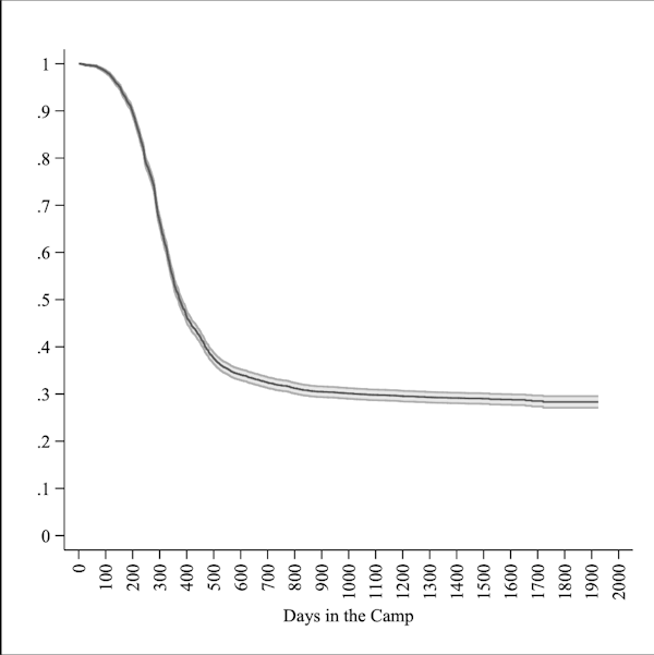 Nuestro estudio primero analiza la probabilidad de supervivencia en el campo. Como muestra el siguiente gráfico, dicha probabilidad de sobrevivir se mantenía cerca de 1 los primeros cien días de estancia, pero empezaba a caer muy rápidamente a partir de ahí, dadas las draconianas condiciones de trabajo, las insuficientes raciones de comida, las enfermedades, así como el asesinato selectivo de prisioneros.
