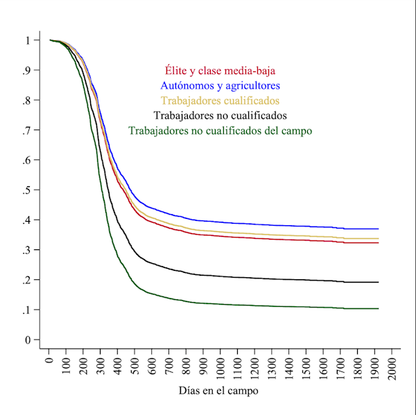 En segundo lugar, y este es el argumento central de nuestro artículo, existe un efecto muy importante de la clase social. En este sentido, los trabajadores de baja cualificación, especialmente los agrícolas, tuvieron muchas menos probabilidades de sobrevivir, principalmente porque no consiguieron acceder a puestos privilegiados y protegidos dentro del campo o en kommandos exteriores.