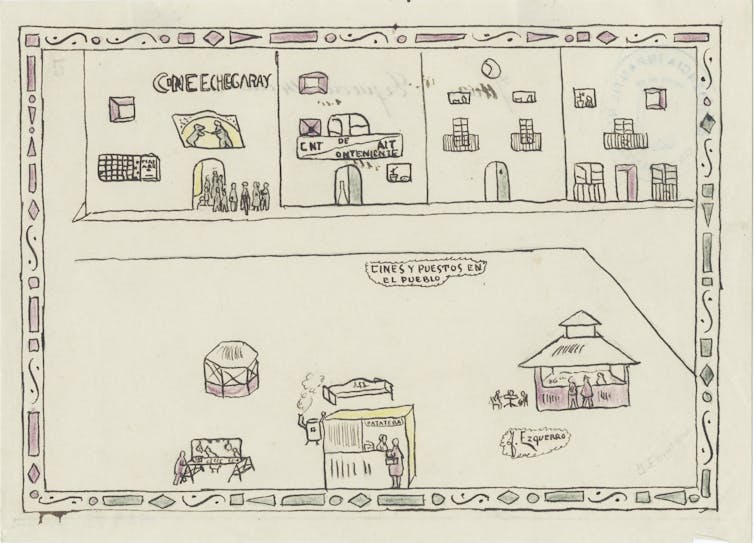 El título de este dibujo es “Cines y puestos en el pueblo” y muestra la vida cotidiana de la plaza de esta localidad. En ella se observa un gran parque con el café-kiosco, el puesto de golosinas sostenido con dos caballetes, la patatería, el templete musical y el banco enfoscado de cal con el respaldo curvilíneo. Al fondo se ve la sede de la Confederación Nacional del Trabajo-Asociación Internacional de los Trabajadores (CNT-AIT) y el Teatro Echegaray. Si comparamos el dibujo con las fotografías no cabe duda de que este niño dibujó fotográficamente la Plaza de Pi y Margall (hoy, Plaza de Santo Domingo).