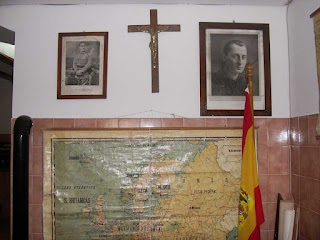 Todo era gris, todo era una mala digestión de ira y de tristeza. En la pared desconchada, observaba en silencio el Caudillo Francisco Franco desde un retrato idílico, observado por el doliente Cristo clavado en una oscura cruz. La bandera, ajada, con el águila de perfil que a los niños les parecía egipcia, movía inquieta el yugo y las flechas gastadas entre hilos despuntados.